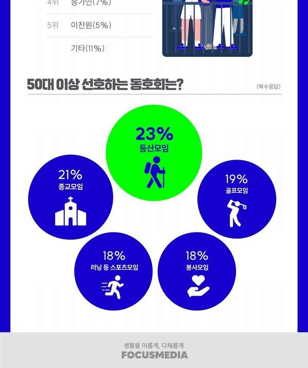 동호회 활동에 가장 적극적인 50대 이상이 선호하는 모임은 등산(23%)이었고, △종교(21%) △골프(19%) △러닝 등 스포츠(18%) △봉사(18%) 모임이 뒤를 이었다.