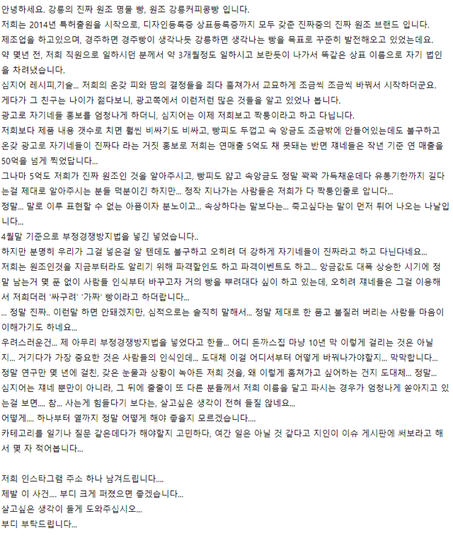 오늘 아프니까 사장이다라는 자영업자 카페에 올라온 글