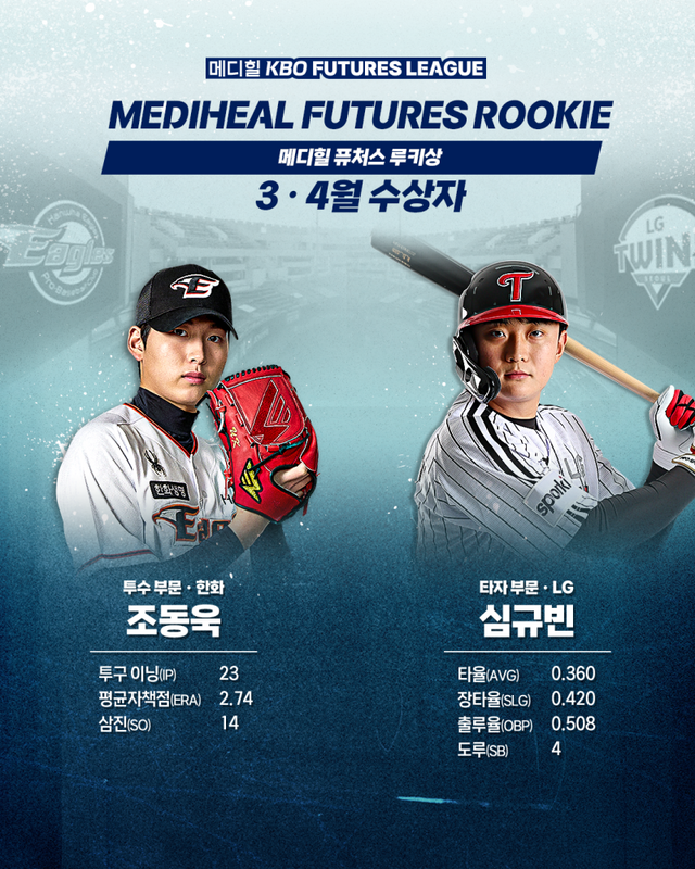 올해 처음 신설된 월간 메디힐 퓨처스 루키상은 입단 1~3년차 선수 중 퓨처스리그에서 규정이닝과 규정타석을 채운 선수를 대상으로 한다. 월간 WAR(대체 선수 대비 승리 기여도) 기준 최우수 투수와 타자를 선정하는 시상이다. 3~4월 성적을 기준으로 한화 투수 조동욱은 WAR 0.63, LG 타자 심규빈은 WAR 0.73을 각각 기록했다.