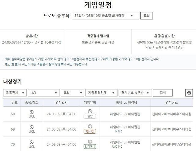 프로토 승부식 57회차 중 레알 마드리드(홈)-바이에른 뮌헨(원정)전을 대상으로 하는 경기는 ▲일반(68번) ▲핸디캡(69번) ▲언더오버(70번)의 3가지 방식으로 즐길 수 있으며, 해당 게임은 8일(수) 오후 9시50분까지 구매가 가능하다.