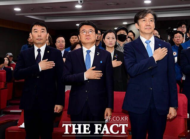 국기에 대한 경례하는 김용민 더불어민주당 의원과 황운하 조국혁신당 의원, 조국 조국혁신당 대표(왼쪽부터).