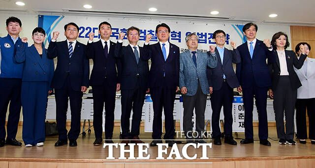 김용민 더불어민주당 의원(왼쪽에서 네번째)과 황운하 조국혁신당 의원(가운데), 조국 조국혁신당 대표(오른쪽 세번째)를 비롯한 참석자들이 기념사진 촬영을 하고 있다.