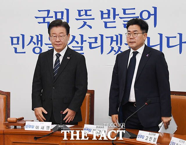 더불어민주당 이재명 대표(왼쪽)와 박찬대 원내대표가 8일 오전 서울 여의도 국회에서 열린 최고위원회의에 참석하고 있다. /배정한 기자