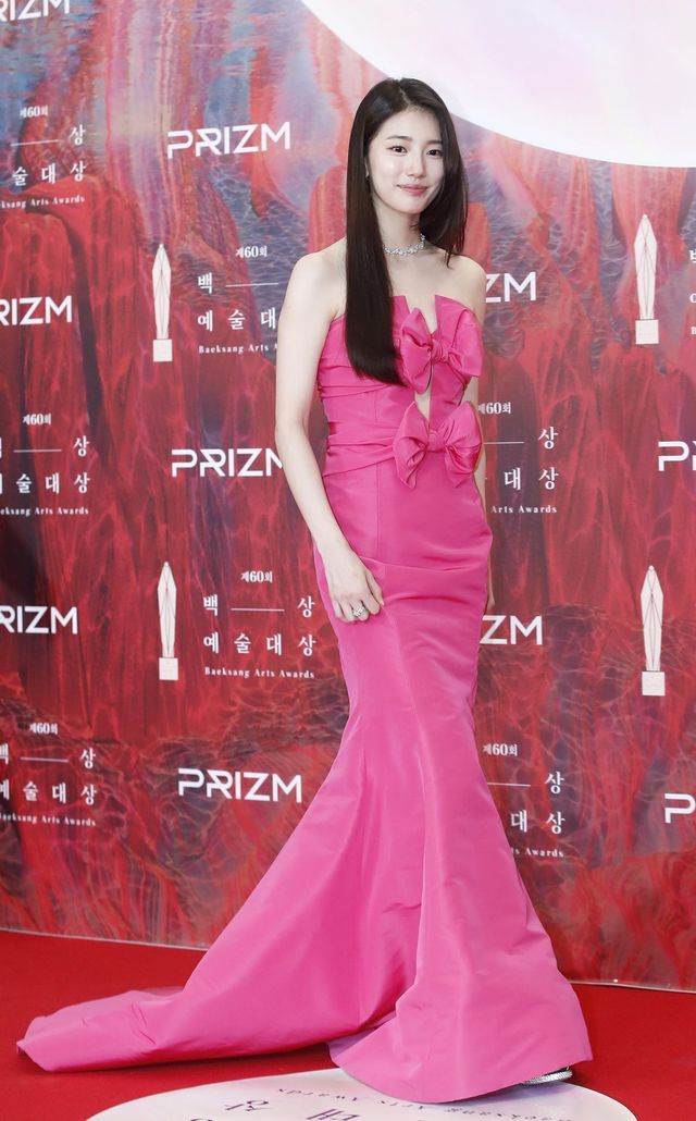 수지는 레드카펫 행사와 시상식 1부에서 핑크색 튜브톱 드레스를 착용했다. 커다란 리본 장식 사이로 가슴선이 드러나는 과감한 디자인이 눈길을 끌었다.