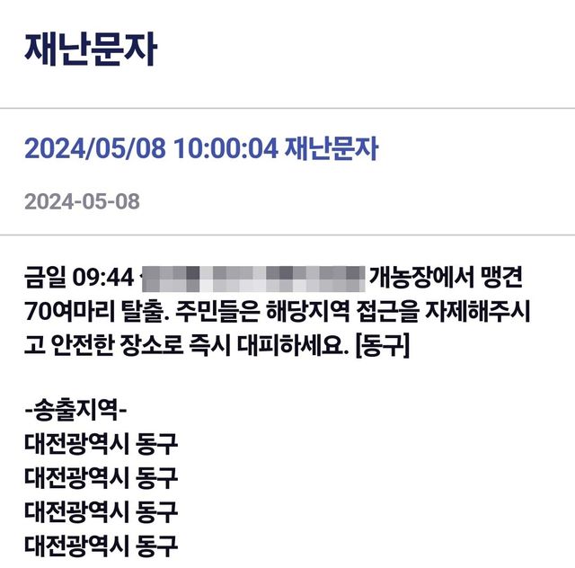 대전 동구청은 이날 오전 10시쯤 삼괴동의 한 개농장에서 맹견 70여 마리가 탈출했다며 주민들에게 재난 문자를 발송했다. 동구청 측은 주민들에게 개농장 주변 접근을 자제하고 안전한 장소로 즉시 대피할 것을 당부했다.
