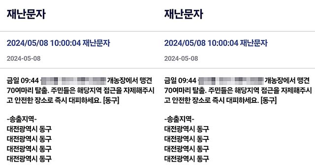 동구청 측은 "개농장에서 70여 마리가 탈출했다는 신고를 받은 119 상황실이 동구청에 공조 요청을 했고 이 과정에서 잘못된 재난 문자가 발송됐다"고 설명했다.