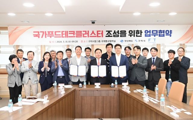 [파이낸셜경제=김예빈 기자] 구미시는 8일 시청 국제통상협력실에서 김학홍 경상북도 행정부지사, 김장호 구미시장, 이기원 (사)한국푸드테크협의회장, 농식품 기업협의체 및 3D프린팅협회원 등 18명이 참석한 가운데 국가푸드테크클러스터 구축을 위한 업무협약(MOU)을 체결했다.