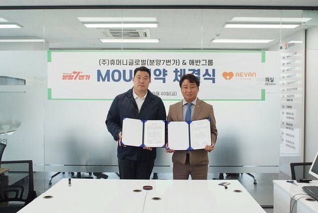 [파이낸셜경제=김예빈 기자] 부동산 시장에 새로운 디지털 비즈니스 모델인 “분양7번가”라는 온라인 플랫폼을 운영중인 ㈜휴머니글로벌과 ‘반려동물의 요람에서 무덤까지 함께하는 기업’ 이라는 슬로건을 걸고 반려동물의 행복과 사회적 책임을 다하고 있는 국내 반려동물 시장의 국내 1위로 시장을 주도하고 있는㈜애반 그룹이 지난 5월3일 애반그룹 본사에서 전략적 업무제휴를 맺었다.