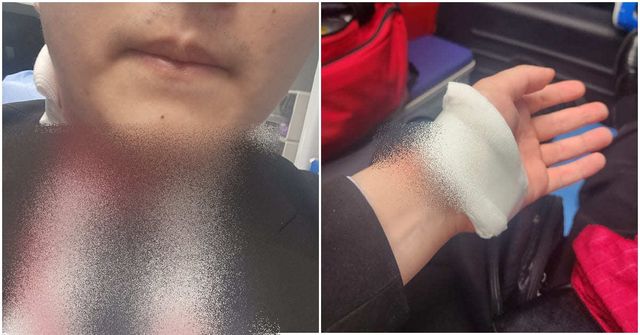 그가 첨부한 사진 두 장에는 구급차 안에서 상처를 입은 목 부위에 거즈를 덧댄 글쓴이의 모습이 담겨 있다. 그의 목에서 흐른 피가 셔츠를 빨갛게 물들여 더욱 충격을 자아낸다.