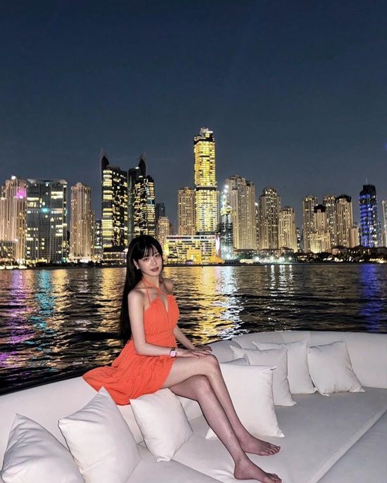 공개된 사진 속 이유비는 두바이 야경이 한눈에 보이는 크루즈에서 검정색 긴 생머리로 주황색 원피스를 입고 포즈를 취하고 있었다.