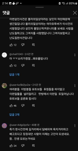 한편 가해자는 범행 후 검거되고도 계속해서 유튜브 활동을 했는데 범행 직후, 직접 112에 전화해 자신이 B씨를 공격했다고 신고했습니다. 또한 체포된 후에는 자신의 유튜브 채널 커뮤니티에 직접 검거 소식을 전하며 유튜브 활동을 이어갔습니다.