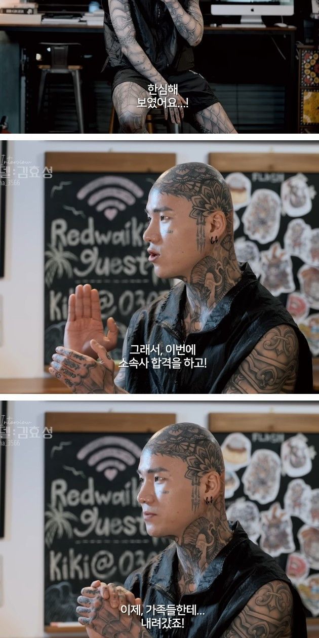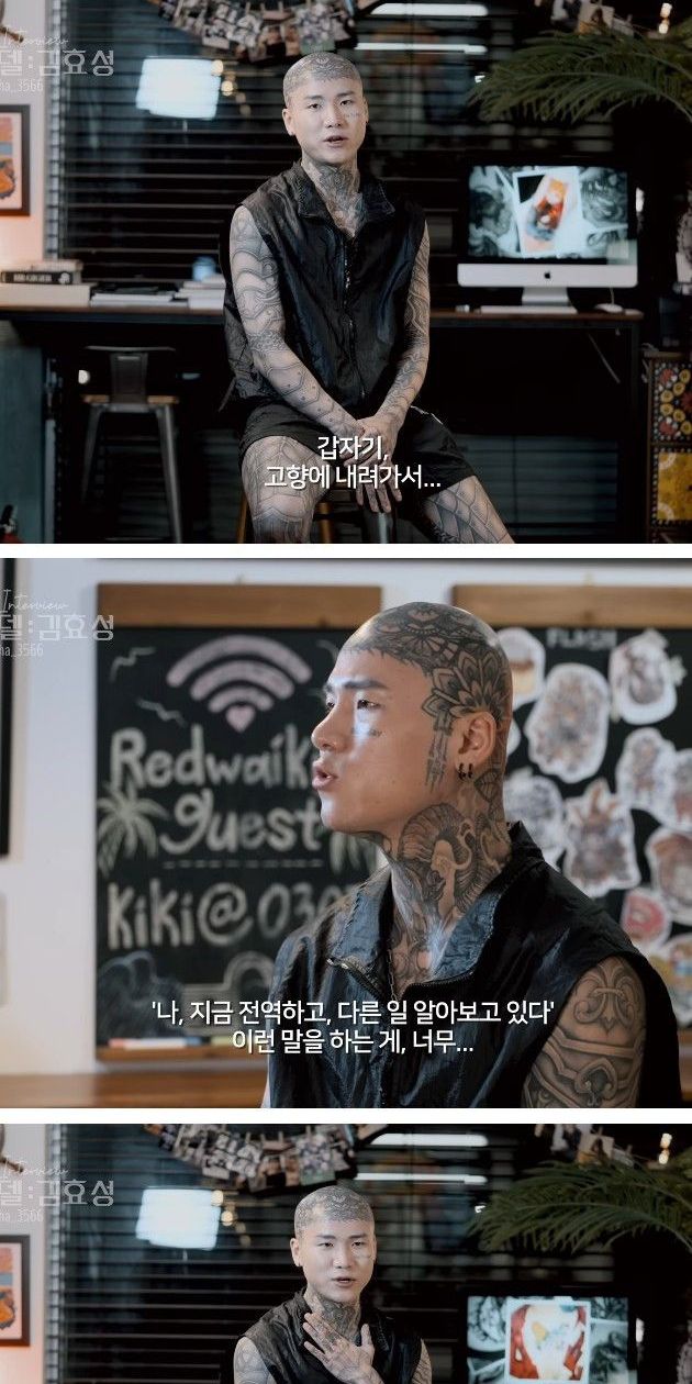 문신한거 보여주기 그래서 아직 군대에 있다고 거짓말 치다가 결국 모델 소속사 들어가서 가족들 만나러 감