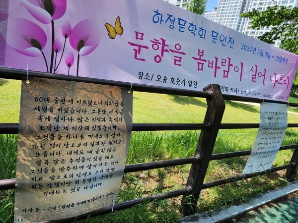김혜식 수필가 겸 평론가와 제자들이 함께 운영하는 순수문학 동인 ‘하정문학회’가 오는 5월 31일까지 충북 오송읍 연제리 호숫가 일원에서 문인전을 개최한다.