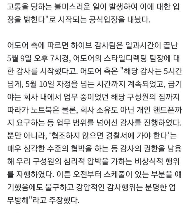 합리적 의사결정 과정을 통해 당사자 간 합의를 마친 내용임에도, 어제 하이브는 갑자기 이를 문제 삼아 해당 스타일디렉팅 팀장에 대한 무리한 감사를 진행했을 뿐만 아니라, 밤 10시가 넘은 심야에 여성 구성원의 집까지 따라가 노트북 이용동의에 대한 서명을 강요하는 등 정상적인 회사에서 할 수 없는 상식 밖의 행위를 자행했습니다. 절차와 내용에 있어서 문제점이 없음에도 불구하고 '배임 횡령 정황이 명확하다' 고 주장하는 것 자체가 하이브 경영진이 업에 대한 이해가 없다는 것을 스스로 증명하고 있습니다. 이번 감사의 방식 또한 업무방해, 강요, 사생활 침해 등에 해당하는 불법적인 방식입니다.