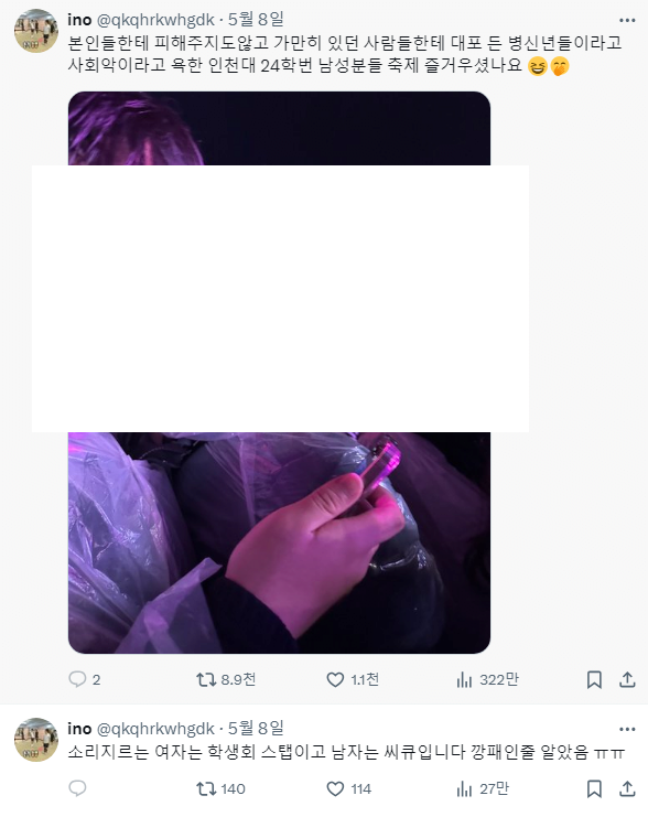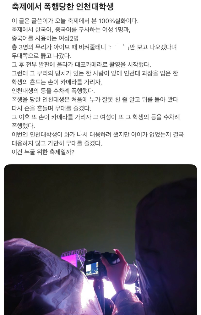 에브리타임에서는 사진 찍는 것에 방해 된다고 앞자리 인천대학생을 때렸다는 이야기도 나옴