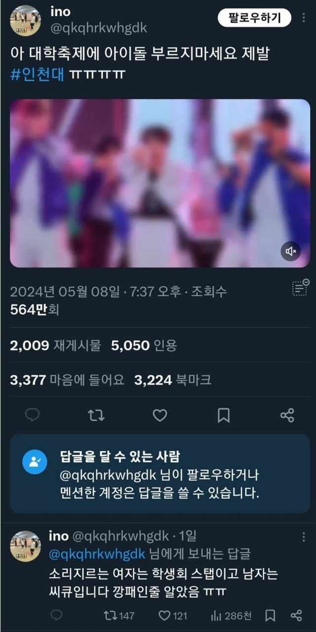 5월 7일 크래비티라는 남자 아이돌이 인천 대학교 축제무대에 등장