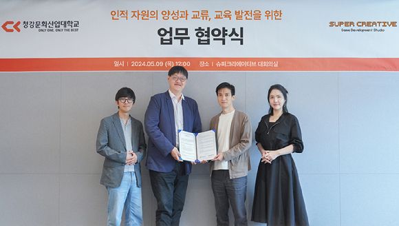 협약식에는 슈퍼크리에이티브 강기현 공동대표, 김윤하 PD, 서형택 경영지원실장과 청강대 게임콘텐츠스쿨 원장 염동현 교수, 김정선 교수가 참석했다.