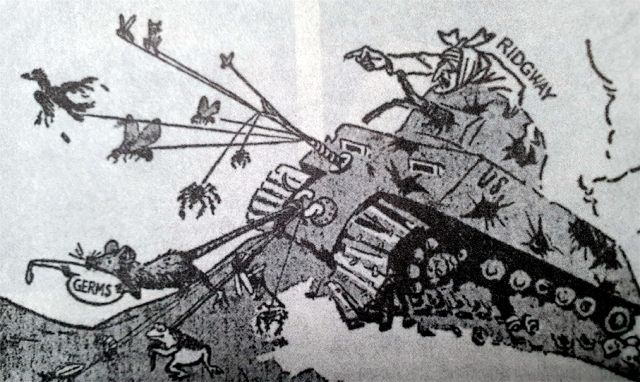 ▲ 미국이 한반도에서 세균전을 펼쳤다는 선전 포스터. 탱크 위의 리지웨이는 1951년 4월 맥아더장군이 해임된 뒤 한국전쟁을 총지휘했던 매슈 리지웨이 대장을 가리킨다.
