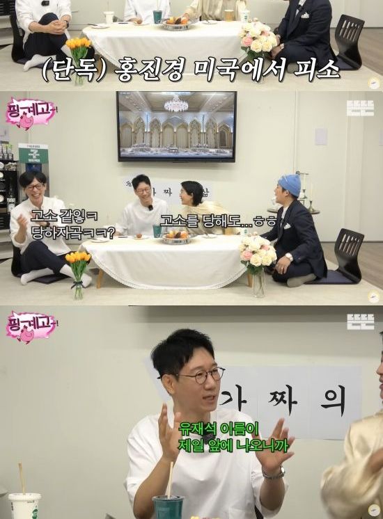이에 지석진은 "그러니까 이걸 왜 하자고 그러는 거야. 넷이 하면 좀 나을까봐?"라고 물었고, 홍진경은 "고소를 당해도, 혼자 당하는 거랑 넷이 당하는 거랑 느낌이 달라"라고 이야기했다.