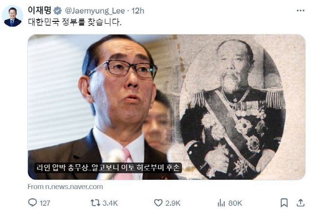 이 대표는 10일 밤과 11일 아침에 걸쳐 SNS를 통해 “이토 히로부미는 조선 영토를 침탈했고 이토 히로부미 손자는 대한민국 사이버영토 라인을 침탈하고 있다”며 “조선, 대한민국 정부는 멍(하게 있다)”라고 비판했다.