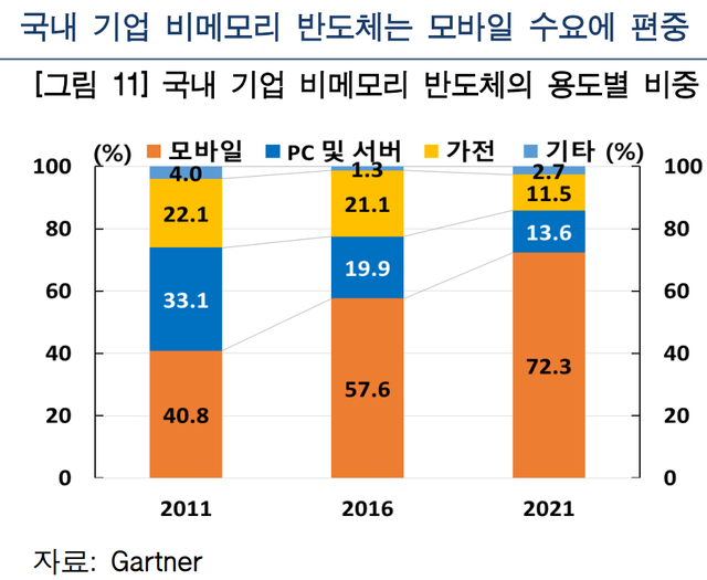 비메모리 반도체의 경우 모바일용에 대한 의존도가 높아 스마트폰 수요 변화에 큰 영향을 받고 있다.