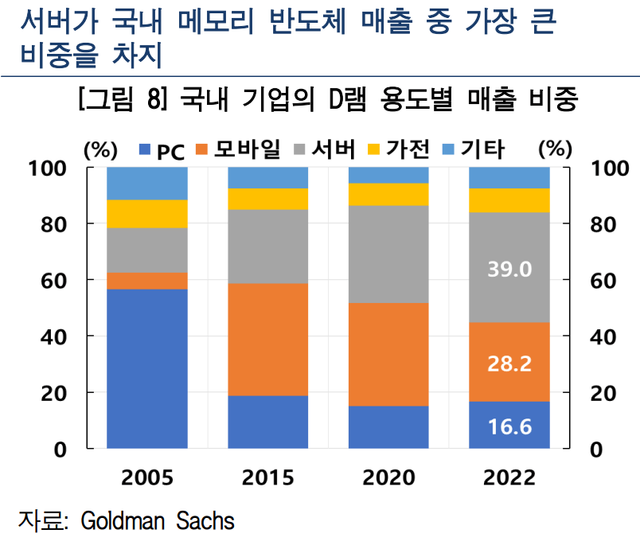 이와 같이 서버용 비중이 높아짐에 따라 국내 메모리 반도체 수출이 데이터센터투자에 큰 영향을 받고 있다. 국내 기업의 메모리 반도체 매출에서 서버가 차지하는 비중은 여타 글로벌 기업들에 비해 높은 편이다.