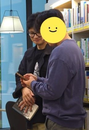 작성자가 공개한 사진 속 한 전 위원장은 분홍색 골전도 이어폰을 착용하고 도서관 열람실에 앉아 책을 읽고 있다. 한 전 위원장은 "좋은 책 읽으시네요"라며 A씨의 책에 사인도 해줬다고 한다.