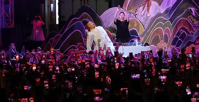 12日,在首尔曹溪寺附近的舞台,电音DJ和尚日进大师(谐星尹圣镐)带来狂欢表演,吸引大批观众前来捧场。