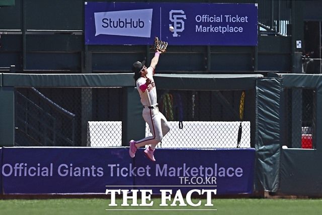1회 초 2사 만루의 실점 위기에서 신시내티의 6번 하이머 칸델라리오의 큼지막한 타구를 처리하기 위해 점프하며 왼손을 펜스 위로 쭉 뻗고 있는 이정후. 타구는 펜스에 맞고 그라운드 안쪽으로 떨어졌으며 이정후는 이 과정에서 어깨를 다쳐 교체됐다./샌프란시스코=AP.뉴시스