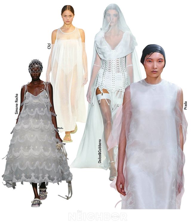 속살이 비치는 시스루 드레스가 버진 로드에 입성한 지는 그리 오래되지 않았다. 색다른 브라이들 룩을 찾는 신부에게 시스루 드레스가 새로운 선택지로 떠오르며 다채로운 디자인이 등장하기 시작한 것. 이번 시즌 프라다와 시몬 로샤, 돌체앤가바나 등 많은 디자이너가 공개한 서로 다른 무드의 화이트 시스루 드레스를 참고해보자. 프라다는 시어 소재를 겹겹이 레이어드해 우아하면서 오묘한 분위기를 선보였고, 시몬 로샤는 리본을 잔뜩 더한 드레스와 크리스털 헤드피스를 매치해 러블리한 매력을 강조했다. 돌체앤가바나는 코르셋 디자인을 활용하고 시폰 소재 베일과 트레인을 길게 늘어뜨려 고혹적으로 마무리했다.