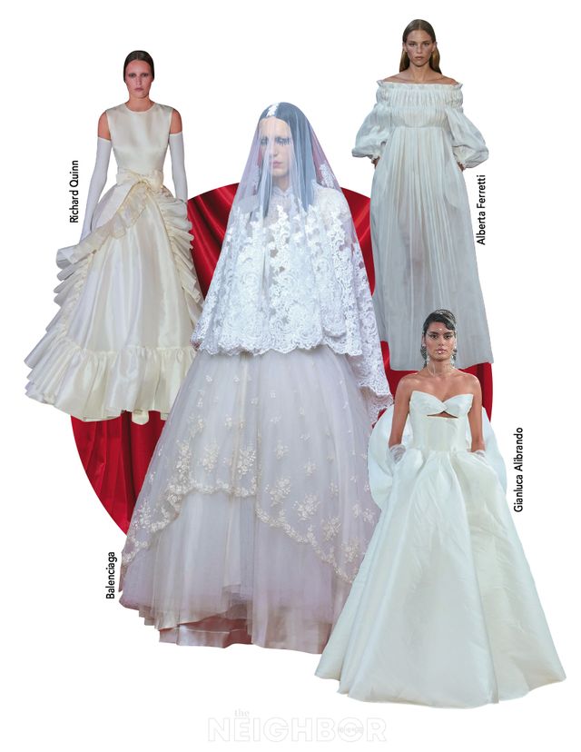 애니메이션 속 공주님처럼 풍성한 드레스를 입고 버진 로드를 걸어 들어가는 상상을 해본 적이 있나. 2024 S/S 시즌 디자이너들은 허리부터 시작하는 풍성한 실루엣의 벨 라인이나 프린세스, 에이라인 드레스로 그동안 꿈꿔온 상상 속 장면을 재현했다. 넓게 퍼지는 형태의 드레스는 통통한 하체는 커버하고, 허리는 잘록하게 강조하는 효과까지 있어 체형 고민이 있는 사람에게 제격이다. 7개의 드레스를 업사이클링한 발렌시아가는 각각의 드레스를 겹치고 트레인을 늘어뜨려 더욱 풍성하게 완성했고, 리차드 퀸은 프릴과 리본 장식으로 고전적인 아름다움을 선사했다.
