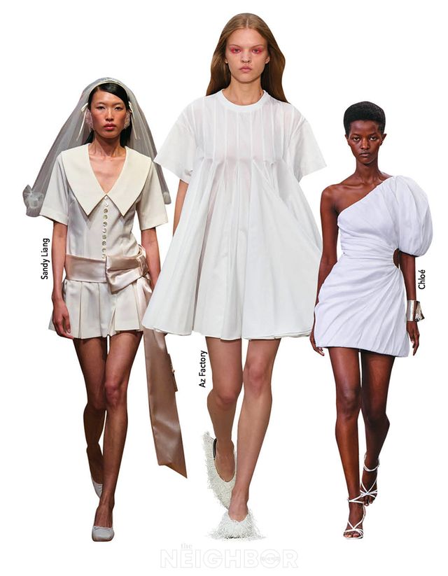 웨딩드레스라고 모두 길어야 할 필요는 없다. 사랑스러운 무드를 선사해줄 로맨틱한 디테일과 함께라면 짧은 길이의 미니드레스로도 충분하니까. 샌디 리앙은 아이코닉한 리본 장식을 활용한 미니드레스에 길이가 짧은 베일을 선택해 귀여운 브라이들 룩을 완성했다. 특별한 장식 없이도 존재감 있는 드레스를 찾는다면 봉긋한 퍼프 슬리브와 허리 부분 컷아웃 디테일로 포인트를 준 끌로에의 드레스를 추천한다. AZ 팩토리처럼 단순한 실루엣의 미니드레스에는 리본이나 크리스털, 진주 등을 더한 화이트 슈즈로 악센트를 주자.