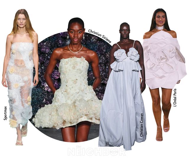 웨딩 데이의 하이라이트 부케만큼이나 화려한 드레스를 입은 인간 부케가 등장했다. 바로 입체적인 꽃 장식이 드레스를 뒤덮은 것. 큼직한 꽃 한 송이가 미니드레스로 탄생한 로레알 파리부터 꽃 두 송이로 톱을 완성한 크리스찬 코완, 화이트 시스루 드레스 위 옐로 꽃을 장식한 스포트막스, 셀 수 없이 많은 꽃을 수놓은 크리스찬 시리아노까지. 비즈나 크리스털처럼 반짝이지 않아도 화려한 드레스를 찾고 있다면 플라워 장식이 돋보이는 드레스를 선택하자. 드레스 위 섬세하게 자리 잡은 꽃들의 존재감이 당신을 더 화사하게 빛내줄 것이다.