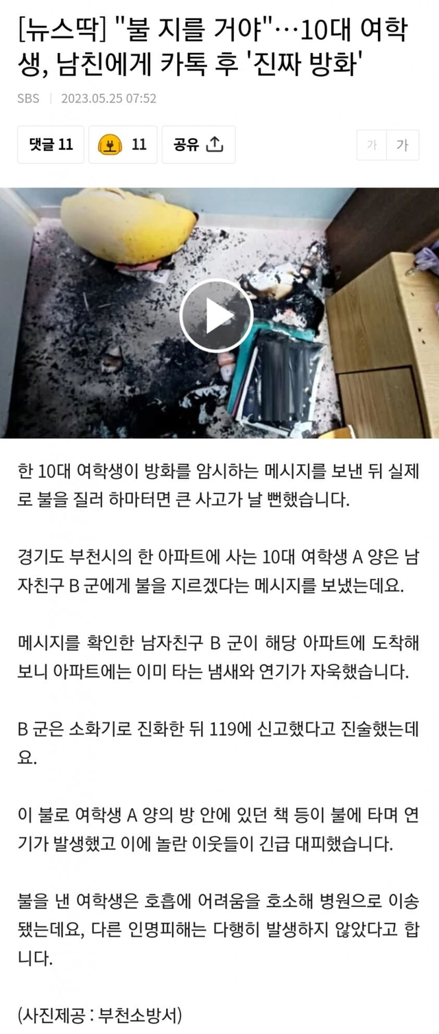 10대 여학생이 불 지르겠다고 예고한 뒤 진짜 불지름