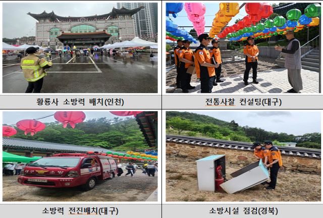 앞서 전국 소방관서는 전통사찰, 일반사찰 등의 화재 위험 요인을 사전 점검하고, 불교계·관련 단체 등 다양한 행사 개최로 촛불·전기 등의 사용이 늘어남에 따라 화기·전기 취급 시 안전에 각별히 주의하도록 사찰 관계자들에게 화재 안전교육 등을 실시했다. 또 전통사찰 대상 현지 적응 소방훈련 등을 중점 실시해 상황 대처 능력을 제고하고, 신속하고 체계적인 화재 출동 체계를 확립했다. 아울러 경찰·전기·가스 등 유관 기관과 신속한 공동 대응이 가능하도록 비상연락체계 확립 등 긴급구조 대응 태세도 강화한다.