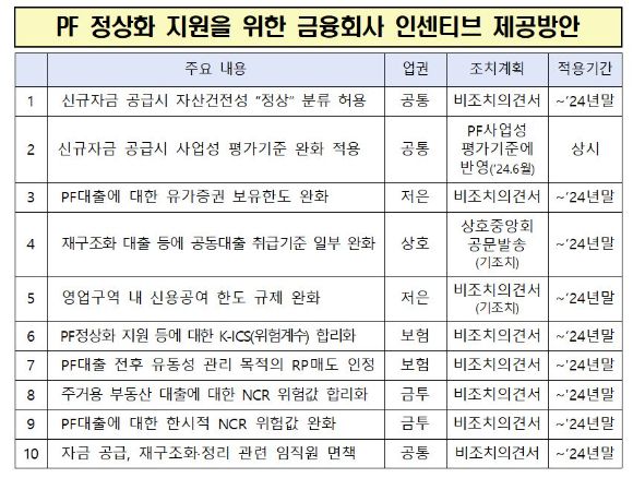 금융투자업권엔 PF-ABCP(자산유동화기업어음) 보증의 PF 대출 전환에 대한 위험 값을 완화하고, 종합금융투자업권엔 주거용 PF 대출의 순자본비율(NCR) 위험 값을 완화해 주기로 했다.