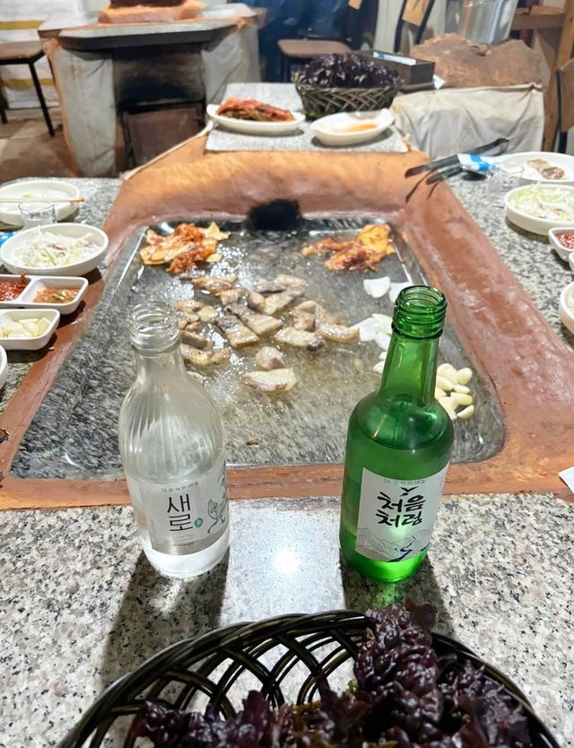 사진에는 돌판에서 익고 있는 고기와 '처음처럼' 소주와 '새로' 소주병 모습이 담겨 있었다. 또 다른 사진에는 '처음처럼' 소주잔도 있었다.