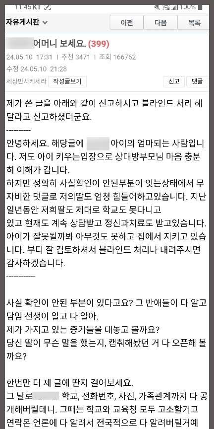 “안녕하세요. 해당 글에 (언급된) OOO 아이의 엄마 되는 사람입니다. 저도 아이 키우는 입장으로 상대방 부모님 마음 충분히 이해가 갑니다. 하지만 정확히 사실 확인이 안 된 부분이 있는 상태에서 무자비한 댓글로 저의 딸도 엄청 힘들어하고 있습니다. 지난 1년 동안 저희 딸도 제대로 학교도 못 다니고 있고 현재도 계속 상담받고 정신과 치료도 받고 있습니다. 아이가 잘못될까봐 아무 것도 못하고 집에서 지키고 있습니다. 부디 잘 검토하셔서 블라인드 처리를 해주시거나 내려주시면 감사하겠습니다.”