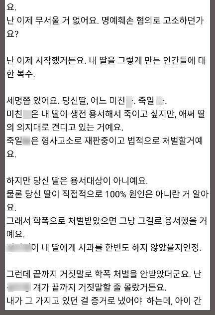 A 씨는 “난 내 딸을 그렇게 만든 인간들에 대한 복수를 이제 시작했다”라면서 “세 명쯤 있다. 당신 딸, 어느 미친 X, 죽일 X”이라고 복수 대상자들을 나열했다. 그는 “미친 X은 내 딸이 생전에 용서해서 죽이고 싶지만 애써 딸의 의지대로 견디고 있다. 죽일 X은 재판을 받고 있다. 법적으로 처벌할 것이다”라고 덧붙였다.