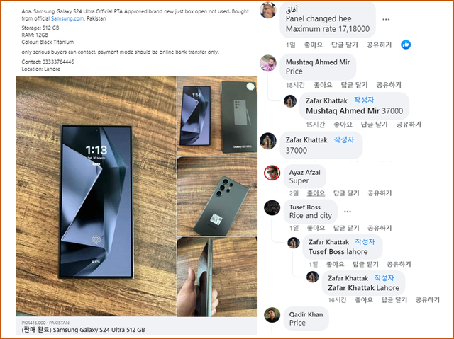 갤럭시 시리즈의 높은 인기는 중고시장에도 고스란히 반영되고 있다. 페이스북 파키스탄 스마트폰 커뮤니티에 갤럭시 시리즈 중고 제품이 올라오면 짦은 시간에 거래 요청이 쏟아지는 것으로 파악됐다. 해당 커뮤니티에서는 스마트폰 모델별로 소비자들 간 평가도 공유되는데 가장 최신 제품인 '갤럭시 S24'를 가장 선호하는 분위기가 역력했다.