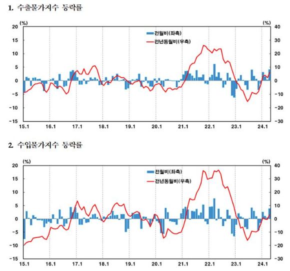 유성욱 한은 경제통계국 물가통계팀장은 "환율이 수출입 물가에 전반적으로 영향을 미칠 수밖에 없다"며 "유가 상승으론 수입 쪽 광산품에 영향을 미쳤고, 수입에서도 석탄·석유나 화학 제품에 상승 요인으로 작용했다"고 설명했다.