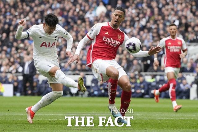 북런던의 앙숙 아스날도 토트넘을 응원하는 상황이 벌어지고 있다. 사진은 토트넘 '캡틴' 손흥민이 28일 '북런던 더비'로 펼쳐진 아스날과 2023~2024 EPL 35라운드 홈 경기 장면./런던=AP.뉴시스