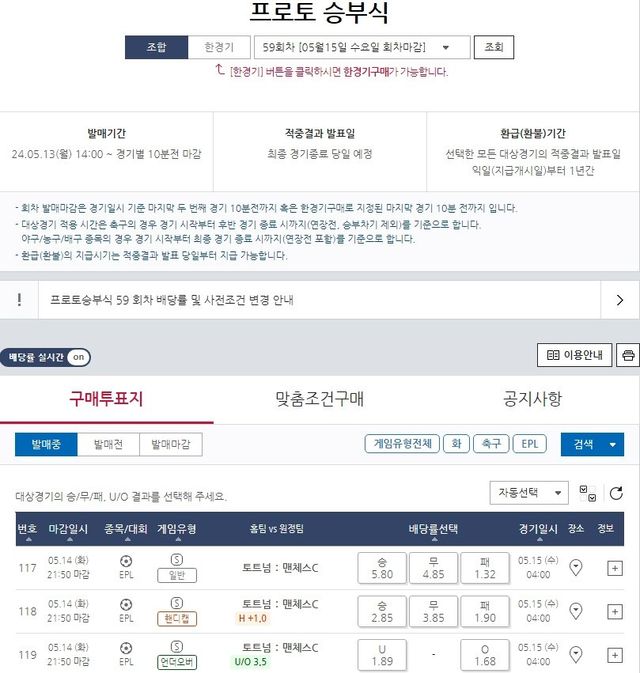 프로토 승부식 59회차에서 토트넘-맨시티전을 대상으로 하는 경기는 ▲일반(117번) ▲핸디캡(118번) ▲언더오버(119번)의 3가지 방식으로 14일(화) 오후 9시50분까지 구매가 가능하다.