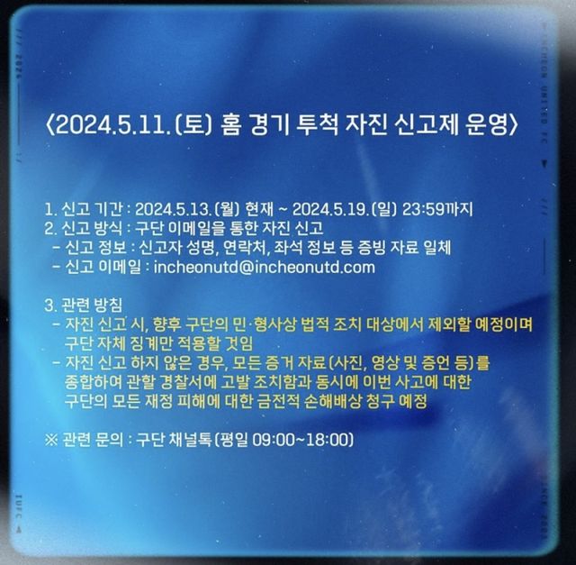 또한 인천 구단은 서울전에서 물병을 던진 이들에게 자진 신고를 받는다.