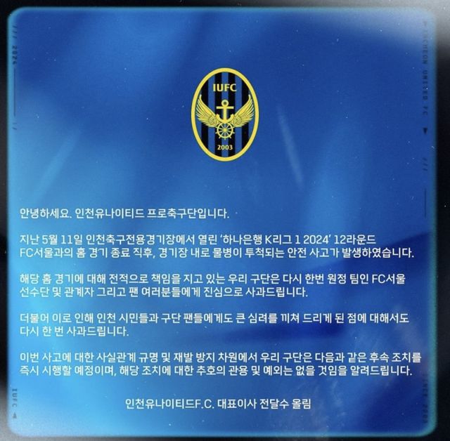 인천은 13일 구단 공식 채널을 통해 “지난 11일 FC서울과 홈 경기 종료 직후 경기장 내로 물병이 투척되는 안전사고가 발생했다”면서 “해당 홈 경기에 대해 전적으로 책임을 지고 있는 우리 구단은 다시 한번 원정팀인 서울 선수단 및 관계자 그리고 팬 여러분들에게 진심으로 사과드린다”고 적었다.
