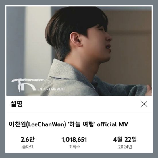 (엑스포츠뉴스 이정범 기자) 이찬원의 '하늘 여행' 뮤직비디오가 100만 뷰를 돌파했다.