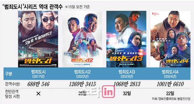 영화 ‘범죄도시4’가 개봉 22일째인 15일 오전 7시 30분께 1000만 관객을 달성했다. 첫 천만 영화 ‘범죄도시2’를 시작으로 ‘범죄도시3’, ‘범죄도시4’까지, 마침내 ‘범죄도시’는 국내 시리즈물 사상 최초 트리플 천만 타이틀을 보유한 유일무이한 프랜차이즈 영화가 됐다. 지난해 ‘범죄도시3’로 ‘신과 함께’ 시리즈에 이은 ‘쌍천만’ 프랜차이즈가 된 후 불과 1년 만에 갈아치운 성과다. 올해 개봉작 기준 ‘파묘’ 이후 두 달 만에 탄생한 두 번째 천만 영화이기도 하다.
