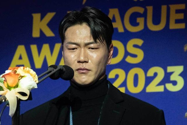 울산현대 김영권이 지난해 12월 4일 서울 송파구 롯데호텔월드에서 열린 '2023 하나원큐 K리그 대상 시상식'에서 K리그1 MVP를 수상한 후 수상소감을 밝히며 울먹이고 있다. / 뉴스1