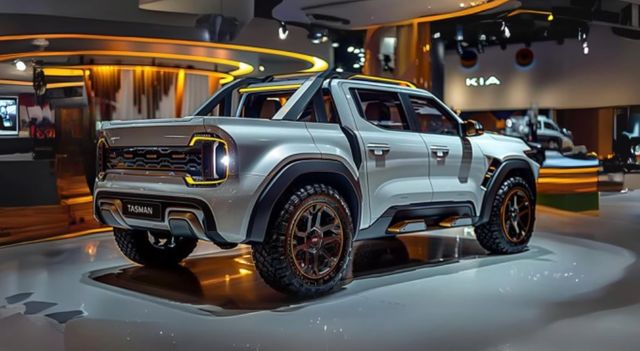 AI가 그린 타스만은 최근 스파이샷으로 포착된 타스만의 이미지보다 훨씬 더 터프하다. 전면부는 거대한 그릴을 적용하고 차체를 높여 압도적인 인상이다.