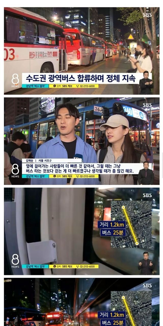 신논현역에서부터 강남역 부근까지 약 1.2km 거리의 두 정거장을 이동하는 데 25분이 넘게 걸렸습니다.